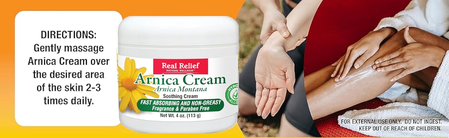 Actually works!. I have fibromyalgia & rub real relief arnica cream on my achey muscles plus my hands from holding book phone or tying too much. This cream works anywhere anytime! It has no smell and is not sticky I have been a user for 3 years and hope they never change it for it works!