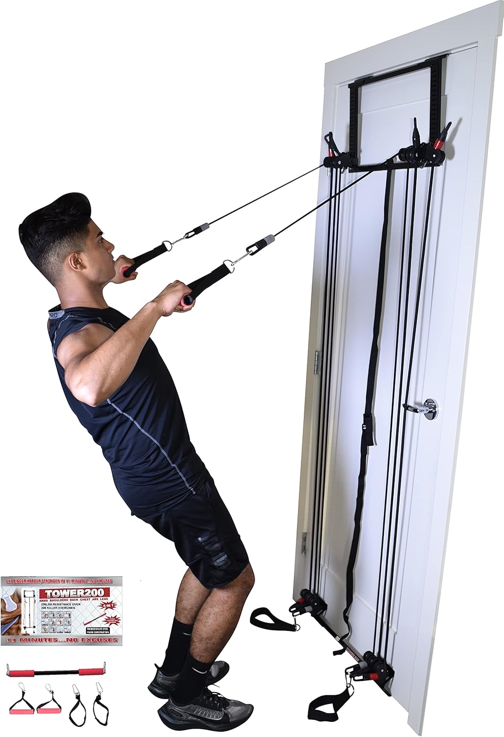 Tower 200 Body by Jake Strength Training Equipment Door-based home gym for working upper and lower body Slides onto any home, office, or dorm door within seconds Multi-tension power cords provide 200 pounds of explosive resistance Supports more than 200 exercises in all; durable steel frame Designed to provide big results within 30 days; limited lifetime warranty.
