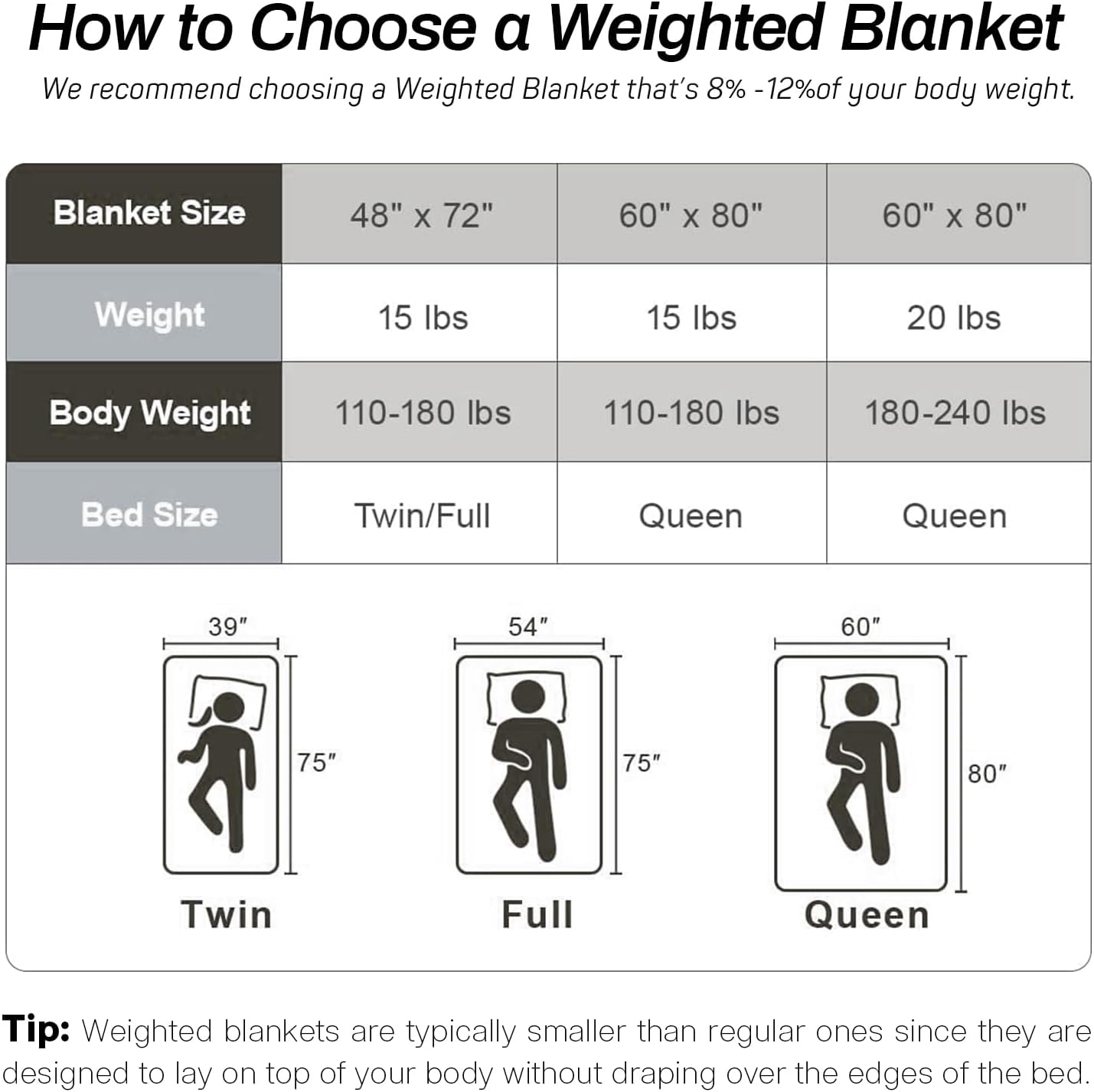 Ideal Size For You: We recommend you choose a weighted blanket weighs about 8% – 12% your body weight. The 15 lbs weighted blanket is for adults between 110 -180 lbs. In case it’s the first time you use a weighted blanket, start off with 15lb Weighted Blanket and you will enjoy its full benefit within a week